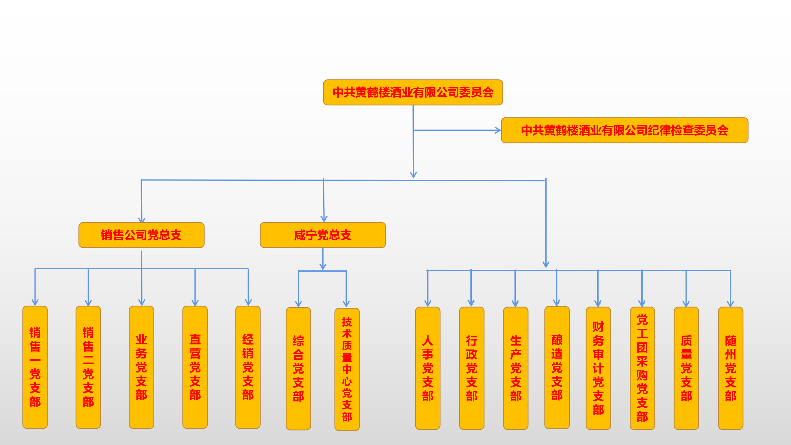 黃鶴樓酒業(yè)黨委于2010年3月成立,現(xiàn)有黨員200余人,黨委委員有7人,下設(shè)2個(gè)黨總支和15個(gè)黨支部。