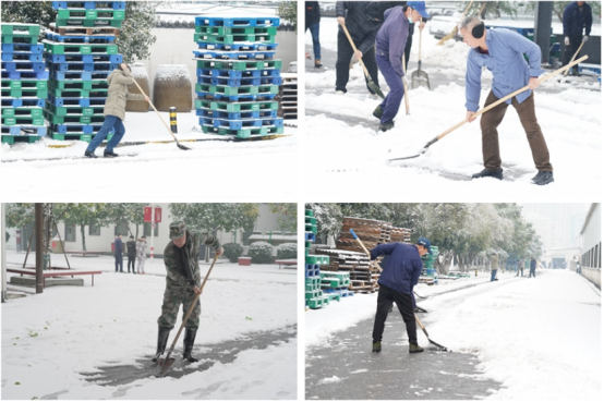 清晨七時(shí)半,志愿團(tuán)隊(duì)早早集合在廠區(qū)開始除雪準(zhǔn)備,為員工步行、車行、旺季發(fā)貨開辟安全通道。往來(lái)員工也自發(fā)加入掃雪團(tuán)隊(duì),大家利用鐵鍬、掃帚、推板等工具,齊心協(xié)力、配合默契,認(rèn)真清掃道路積雪,鏟除凝固冰層,在冰雪中開辟暢通之路。